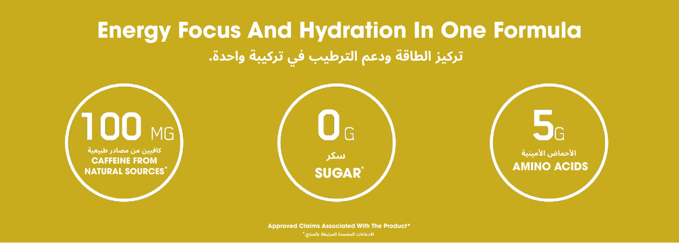 - تركيبة مُحسنة 3 في 1 لدعم الطاقة، والتركيز، وترطيب الجسم¹*.